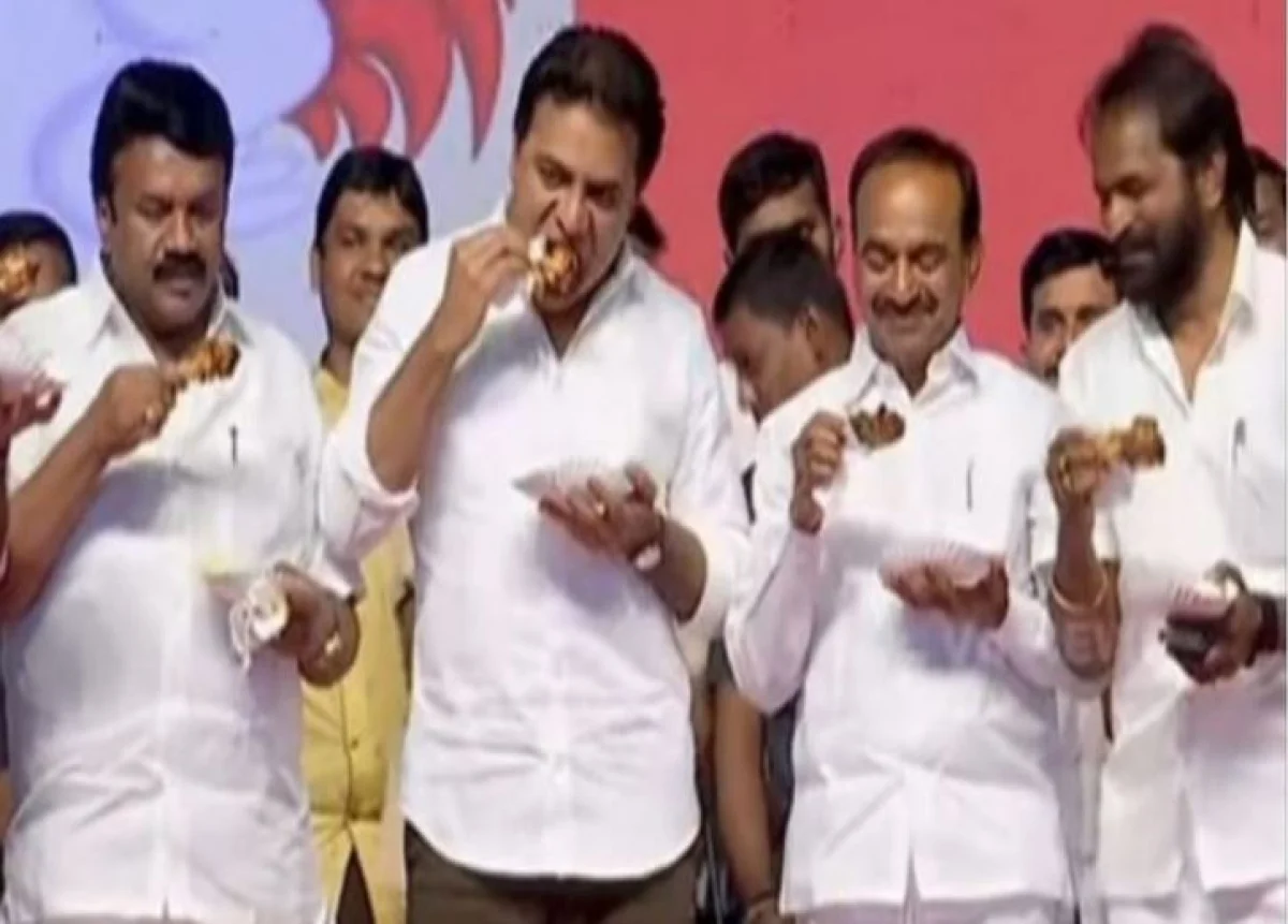 दरअसल, कोरोना वायरस का शक दूर करने के लिए तेलंगाना सरकार के मंत्री हजारों लोगों के सामने मंच पर चिकन खा रहे हैं। यानी सार्वजनिक कार्यक्रम में नेता चिकन खा रहे हैं। इस काम के लिए एक साथ सार्वजनिक मंच पर आए मंत्रियों में केटी रामाराव, एटेला राजेंद्र, तालासानी श्रीनिवास यादव शामिल थे। जिन्होंने लोगों के सामने चिकन खाया।
