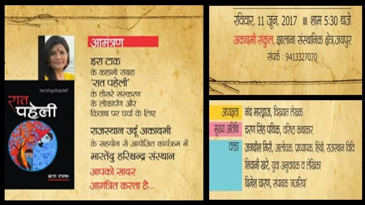 भारतेंदु हरिश्चंद संस्थान और राजस्थान उर्दू अकादमी की ओर से "रात पहेली" (हिमाचल बुक्स / भारत पुस्तक भण्डार, नई दिल्ली) किताब का तीसरे संस्करण का लोकार्पण 11 जून को अकादमी संकुल सभागार, झालाना संस्थानिक क्षेत्र में शाम 5:30 बजे किया जाएगा। इस दौरान किताब पर चर्चा भी होगी। इरा टाक द्वारा लिखित किताब, "रात पहेली" का यह मात्र 6 महीने में तीसरा संस्करण है।