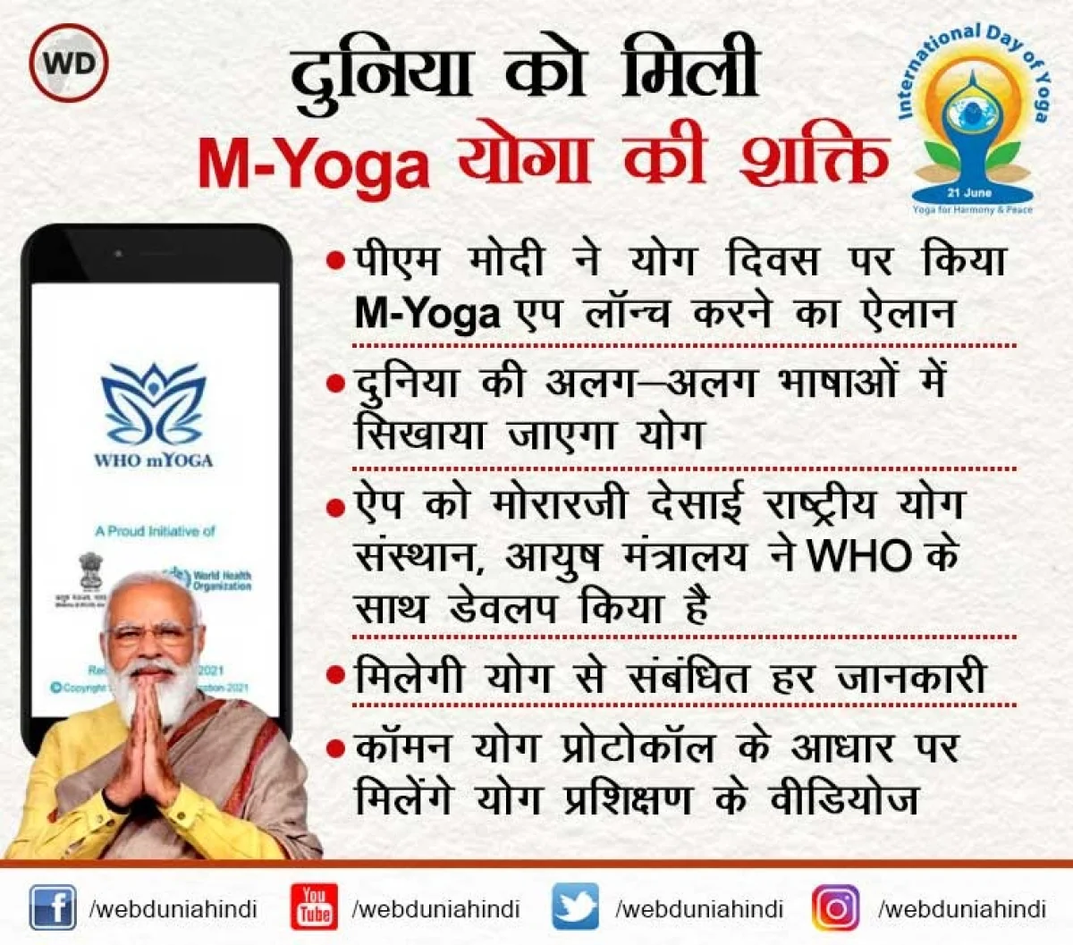 अंतरराष्ट्रीय योग दिवस के मौके पर भारत की ओर से दुनिया को एक और बड़ी सौगात दी गई है। प्रधानमंत्री नरेंद्र मोदी ने सोमवार को अपने संबोधन में M-Yoga एप लॉन्च करने का ऐलान किया है। इस ऐप के जरिये दुनिया की अलग-अलग भाषाओं में योग सिखाया जाएगा।
