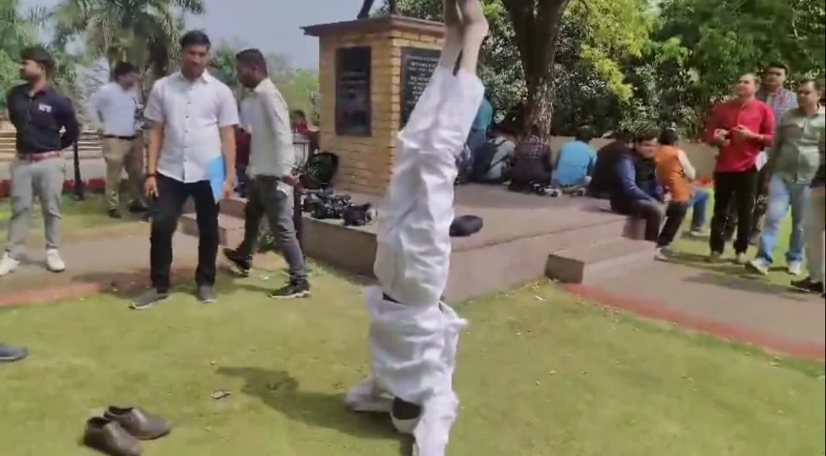 श्योपुर से कांग्रेस विधायक बाबू जंडेल ने शुक्रवार को विधानसभा में अनोखा विरोध प्रदर्शन किया। महाशिवरात्रि पर हर्ष फायरिंग के मामले में FIR होने पर कांग्रेस विधायक ने शुक्रवार को विधानसभा परिसर मे शीर्षासन कर अपना विरोध दर्ज कराया। बाबू जंडेल ने अपने खिलाफ हर्ष फायरिंग की FIR को राजनीति से प्रेरित और झूठा बताते हुए सदन के बाहर गांधी प्रतिमा के सामने भी बिना नारेबाजी करते हुए शीर्षासन मुद्रा में प्रदर्शन किया।