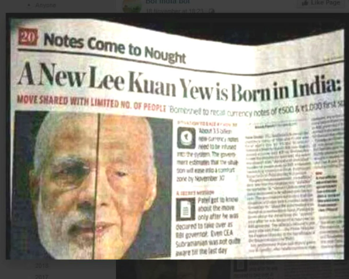 Congress Mukt Bharat, I Support Narendra Modi, We Support Republic समेत कई भाजपा समर्थित फेसबुक पेजेस ने इस तस्वीर को शेयर करते हुए लिखा है- ‘यह सिंगापुर के अखबार की हेडिंग है। वे जानते हैं कि यह शक्स कौन है। उम्मीद है कि आप इस बात को जल्द समझेंगे। यह एक गर्व का पल है और हम खुशनसीब हैं कि ऐसे समय में पैदा हुए, क्योंकि आज हम अपने देश को बदलते देख रहे हैं। ली कुआन यू वह शख्शियत हैं जिन्होंने मछली व्यापार करने वाले एक छोटे से शहर सिंगापुर को आर्थिक शक्ति के रूप में बदला। दूसरे देश हमारे प्रधानमंत्री के प्रयासों की प्रशंसा कर रहे हैं।’